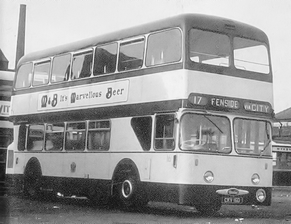 Double deck with Neepsend bodywork, rear engine, automatic front doors and front stairs § East Lancs bodywork Gardner 6LX 10.45 Litre engine with fluid flywheel and four-speed Daimatic, semi-automatic, direct selection, epicyclic gearbox Air brakes Upper saloon: 45 seats Lower saloon: 31 seats |
